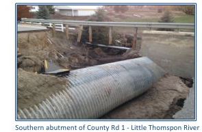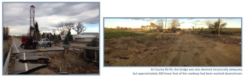 At the southern bank of the Little Thompson River the approaches at both the County Road 1 and County Road 44 crossings were severely eroded during the flood events of September 2013. The bridge itself had been deemed structurally adequate, the southern approach to the bridge was destroyed. A large corrugated metal pipe (CMP) beneath the roadway was used as a cattle crossing had shifted and displaced substantially during the event. Based on the survey provided, the roadway surface in this area was approximately 10 to 15 feet above current grades at the bridge abutment. Repairs included installation of a new CMP cattle crossing, new cast-in-place concrete headwalls and wing walls, placement of earthen embankment/structure backfill fill soils, installation of rip-rap on the embankment slopes, and repaving of the approach to the southern end of the existing bridge.