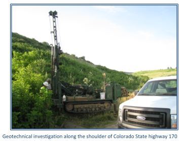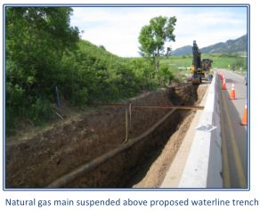 The City of Louisville owns and operates a raw water line which runs along the south/east side of Colorado State Highway 170, which leads into and out of Eldorado Canyon State Park. Due to installation of a new culvert beneath a segment of the highway and lowering of an existing natural gas main, the City’s water line needed to be relocated. In order to provide the design and construction team with the required information, it was necessary to perform geotechnical investigation at two locations along the alignment.
